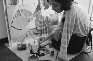 Formada em Estudos de Mídia e com passagem por Relações Internacionais, Joana traz para a arte um pensamento agudo sobre cultura e política. Seu engajamento no feminismo interseccional e na causa LGBTQIAPN+ — causas que vive em primeira pessoa — reflete-se em uma obra onde a figura feminina é protagonista, mas nunca estática: suas composições escancaram as fissuras sociais e emocionais da experiência da mulher contemporânea. Aqui, o corpo é território de disputa e afeto, e a visualidade, ainda que fragmentada, integra os opostos que a constituem: o caos e a contemplação; a violência e o delicado; o figurativo que se desfaz em abstração.